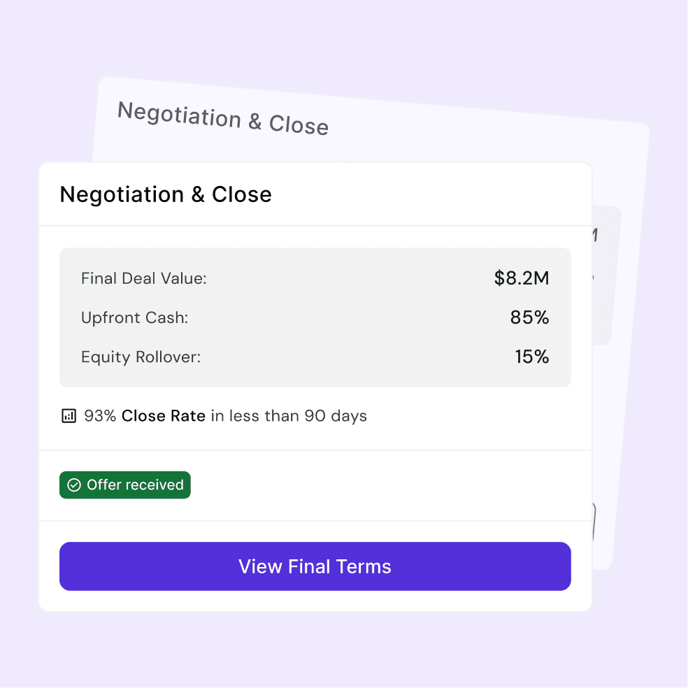 Our team handles the final stretch: deal terms, legal docs, asset transfers. You stay in control while we streamline the close and make sure everything lands where it should.